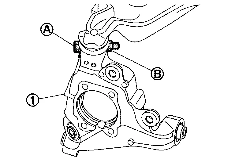 Remove rear suspension arm mounting bolts (A) and nuts (B) from axle housing (1).