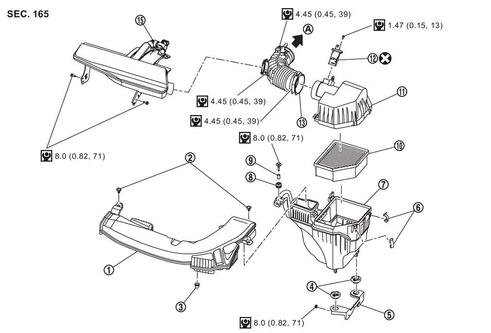 | 10. | Air cleaner filter | 11. | Air cleaner cover | 12. | Mass air flow sensor |