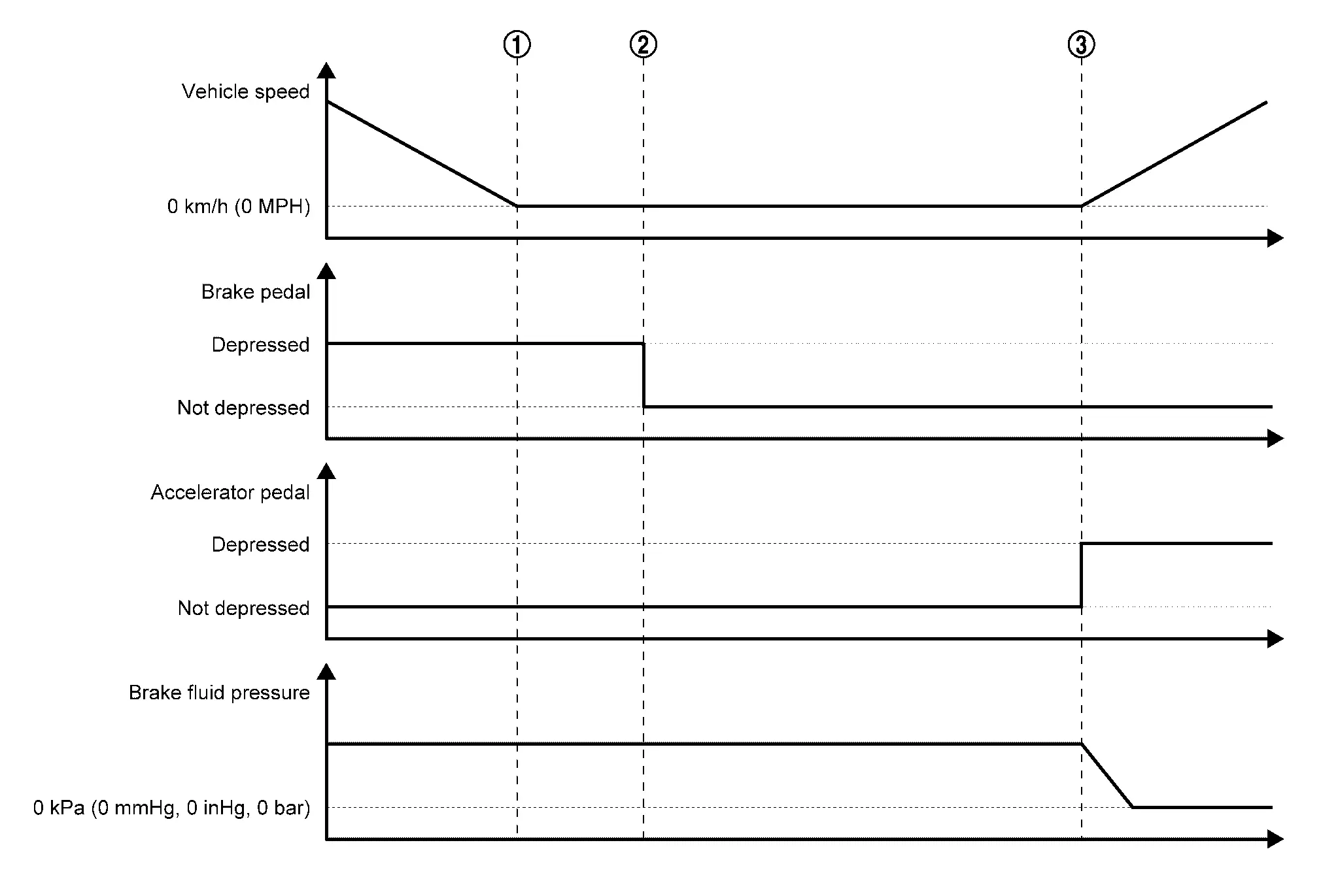 Automatic brake hold function is applied (this function holds brake fluid pressure even after the driver has released brake pedal).