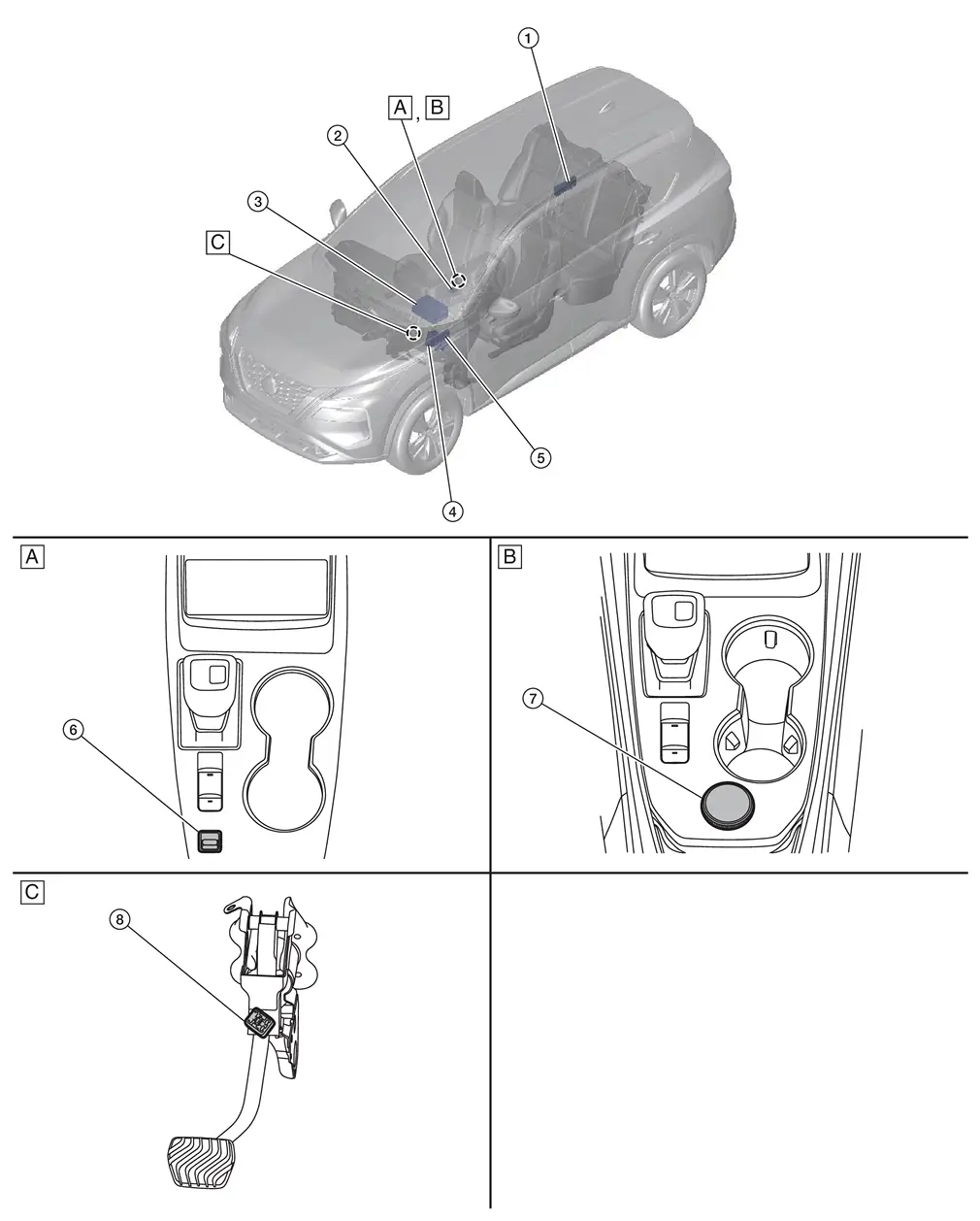 | A. | Center console finisher (2WD) | B. | Center console finisher (AWD) | C. | Brake pedal assembly removed |