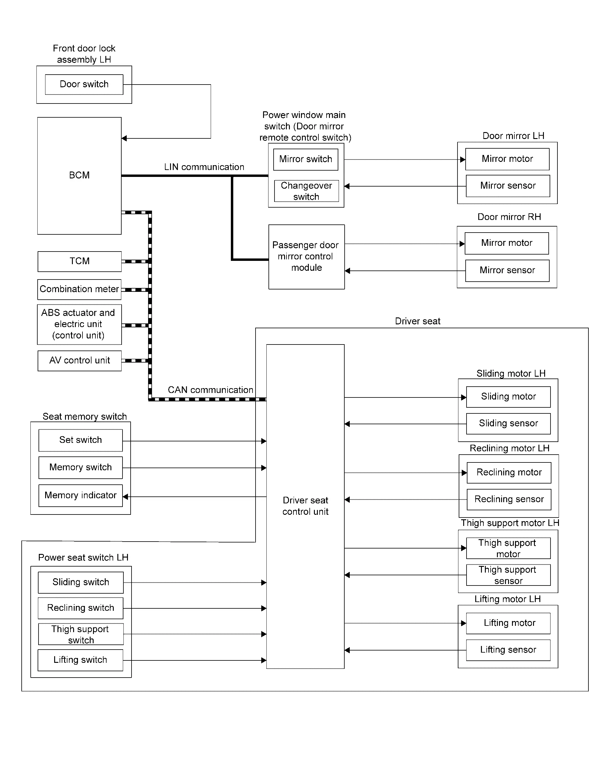 Several types of signals are transmitted from the following units to the driver seat control unit via CAN communication.