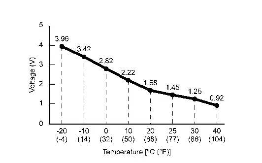Terminal Condition Resistance: kΩ Temperature: °C (°F) 1 2 −20 (−4) 23.60 −10 (14) 13.46 0 (32) 8.00 10 (50) 4.93 20 (68) 3.14 25 (77) 2.54 30 (86) 2.06 40 (104) 1.39