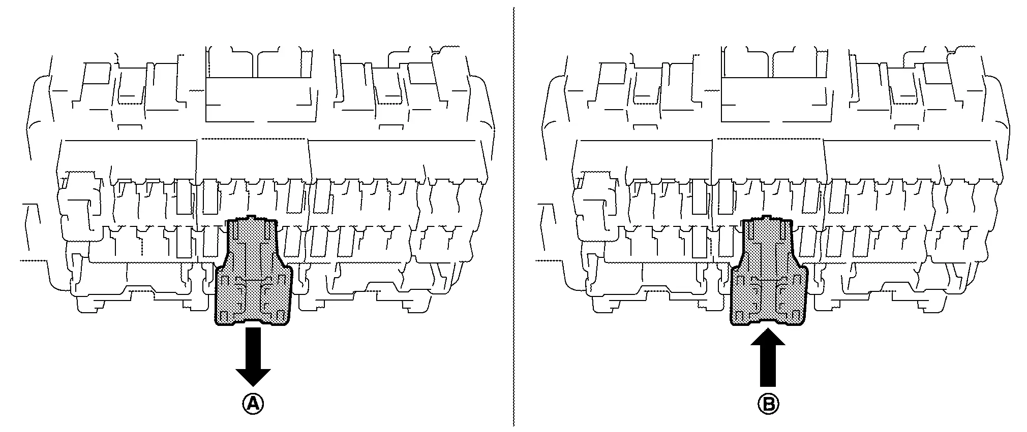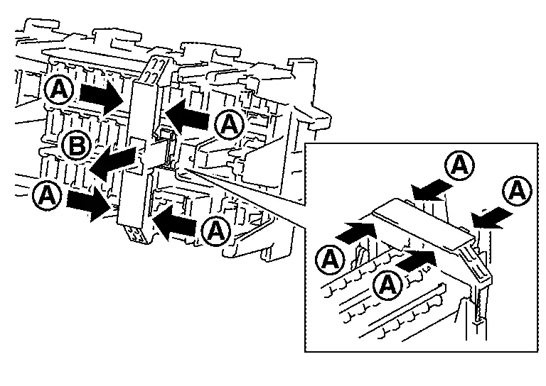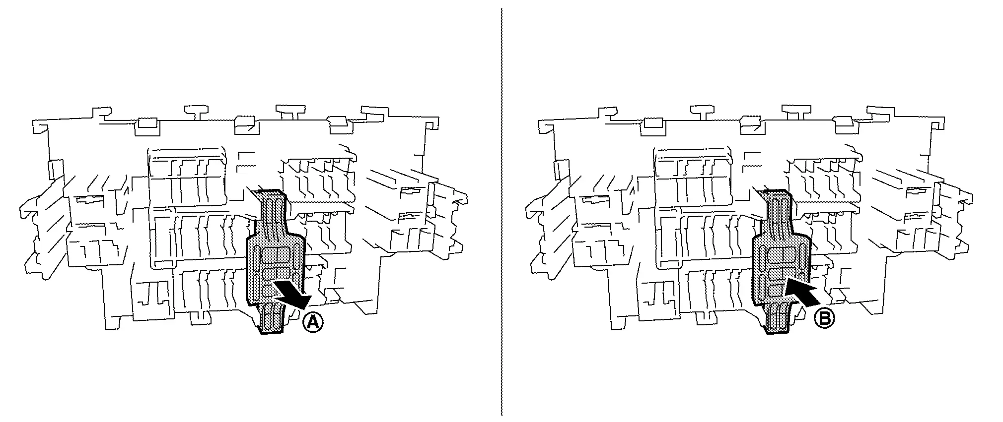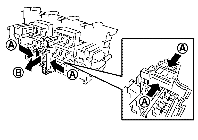 Press pawl (A) and tilt to disengage the extended storage switch. Press pawl (B) and tilt to remove the extended storage switch.