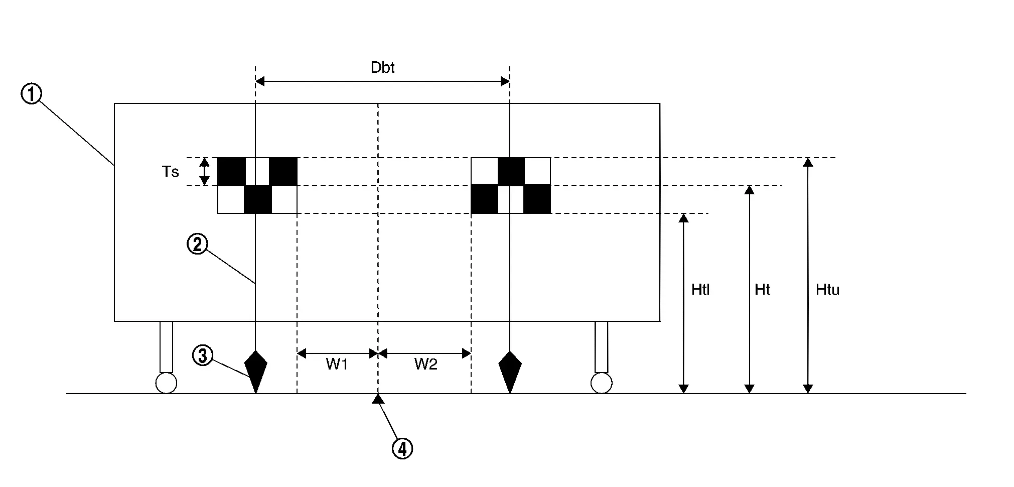 Center between two targets Side of a target (Ts) : 120 mm (4.72 in) Height of a target lower end (Htl) : 1,180 mm (46.46 in) Height of a target center (Ht) : 1,300 mm (51.18 in) Height of a target upper end (Htu) : 1,420 mm (55.91 in) Width between a right target center from a left target center (Dbt) : 720 mm (28.35 in) W1 : 180 mm (7.09 in) W2 : 180 mm (7.09 in) -