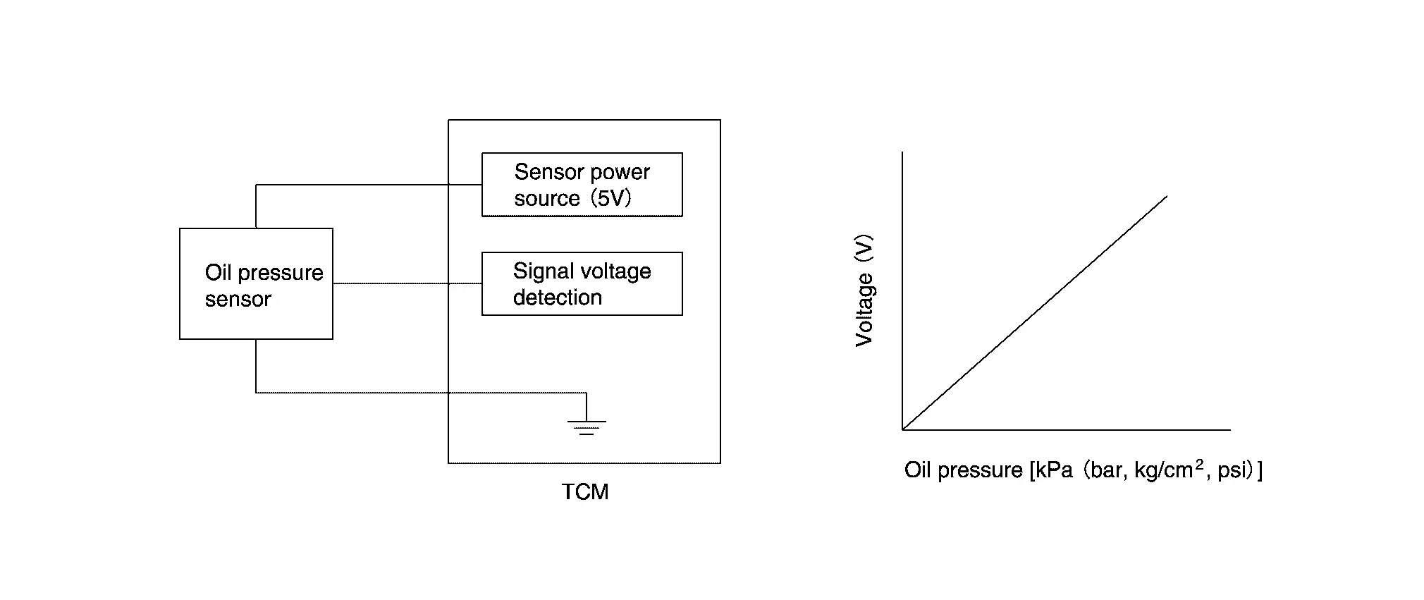 The line pressure sensor transfers detected line pressure to TCM as voltage signal.