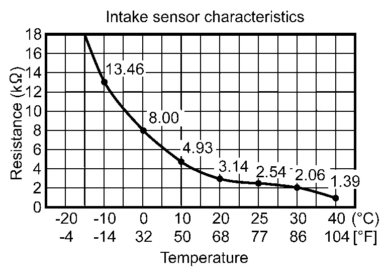 The intake sensor converts the evaporator surface temperature detected with thermistor into the voltage, and the A/C amp. inputs this voltage.