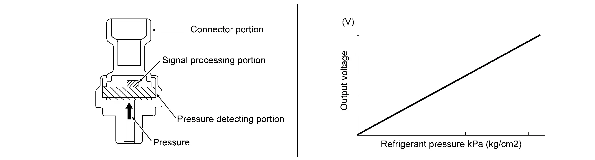 The refrigerant pressure sensor is a capacitance type sensor. It consists of a pressure detection area and a signal processing area.