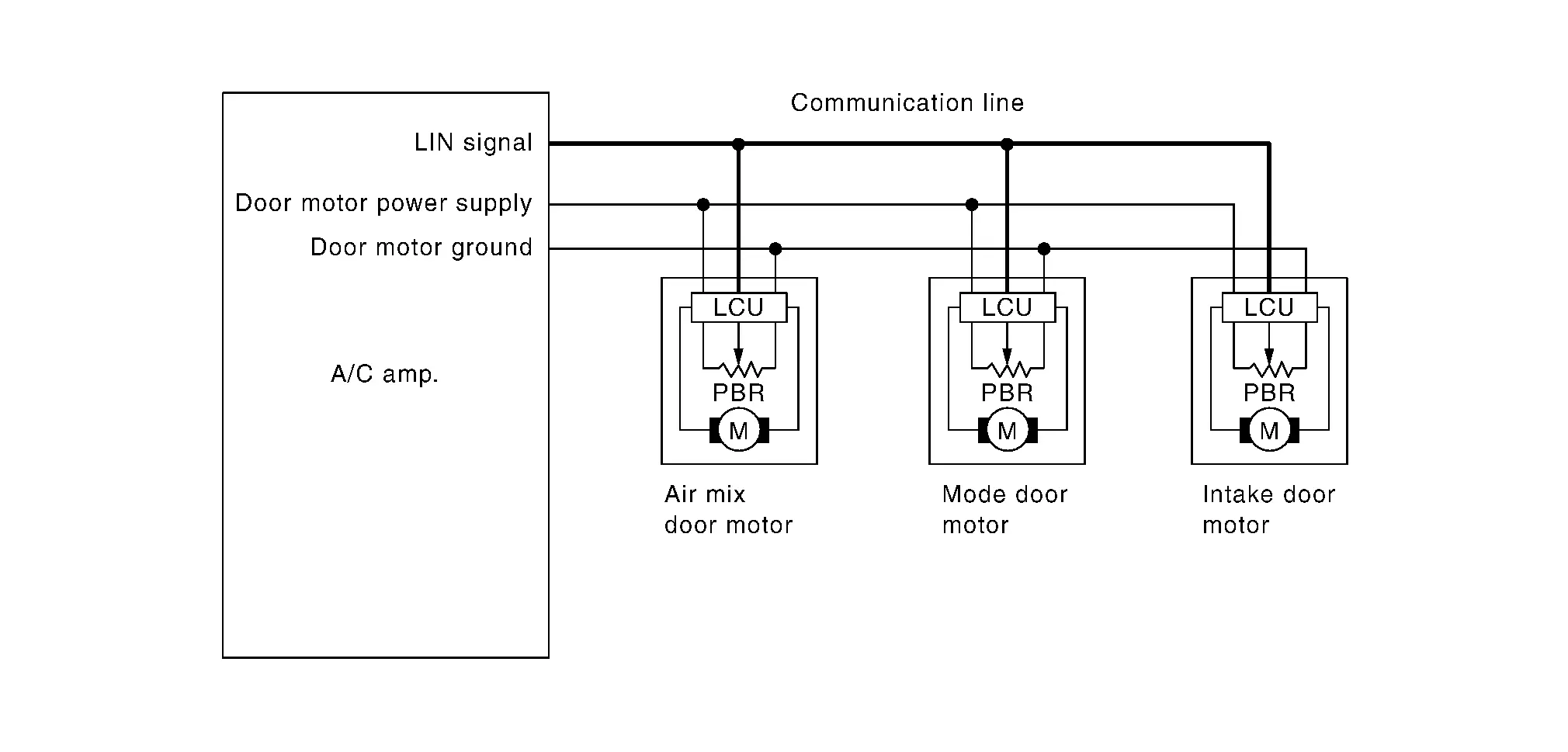 Air mix door motor consists of motor that drives door, PBR (Potentio Balance Register) that detects door position and LCU (Local Control Unit) that perform multiplex communication control (LIN) with A/C amp.