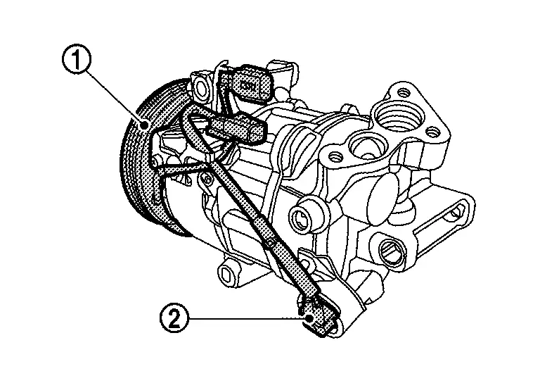 When Smart FET integrated in IPDM E/R turns ON, electricity is supplied to field coil, clutch disc is presses to pulley, and engine rotational movement is transmitted from crankshaft pulley ⇒ drive belt ⇒ pulley ⇒ clutch disc ⇒ drive shaft. A/C compressor is operated. When Smart FET turns OFF, electricity is not supplied to field coil, and clutch disc is released from pulley. A/C compressor is not operated.