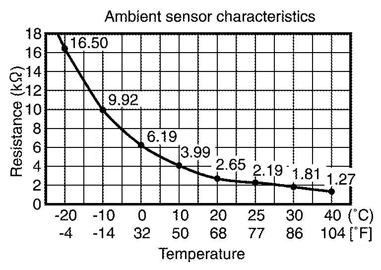 The ambient sensor measures the ambient air temperature, and transmits the ambient sensor signal to the combination meter. This sensor uses a thermistor with electrical resistance that decreases as the temperature increases.