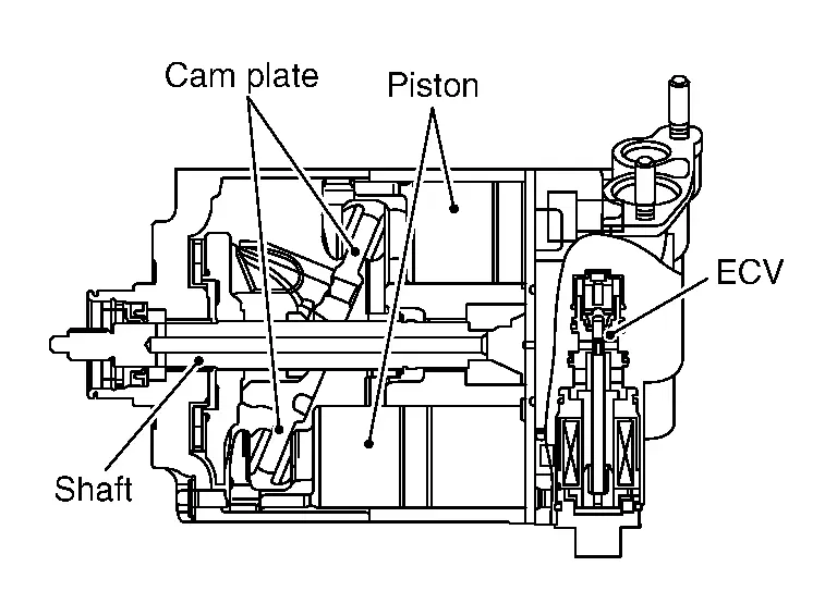 ECV varies the refrigerant pressure balance in the left and right refrigerant spaces that are divided by the cam plate in order to change the angle of the cam plate inside the A/C compressor.