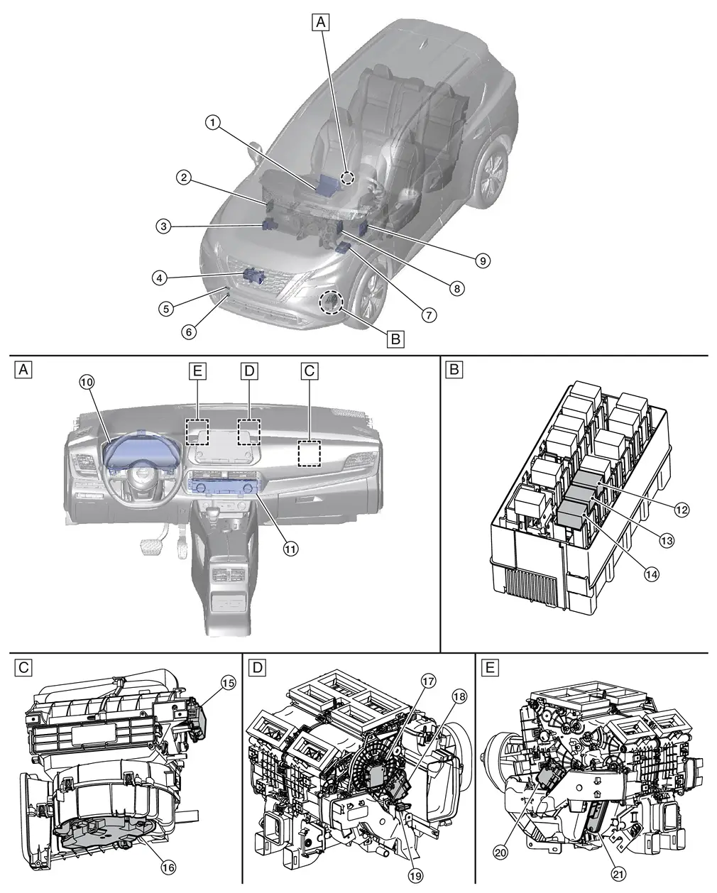 | A. | Instrument panel | B. | Left front of Nissan Ariya vehicle | C. | Right side of blower unit assembly |