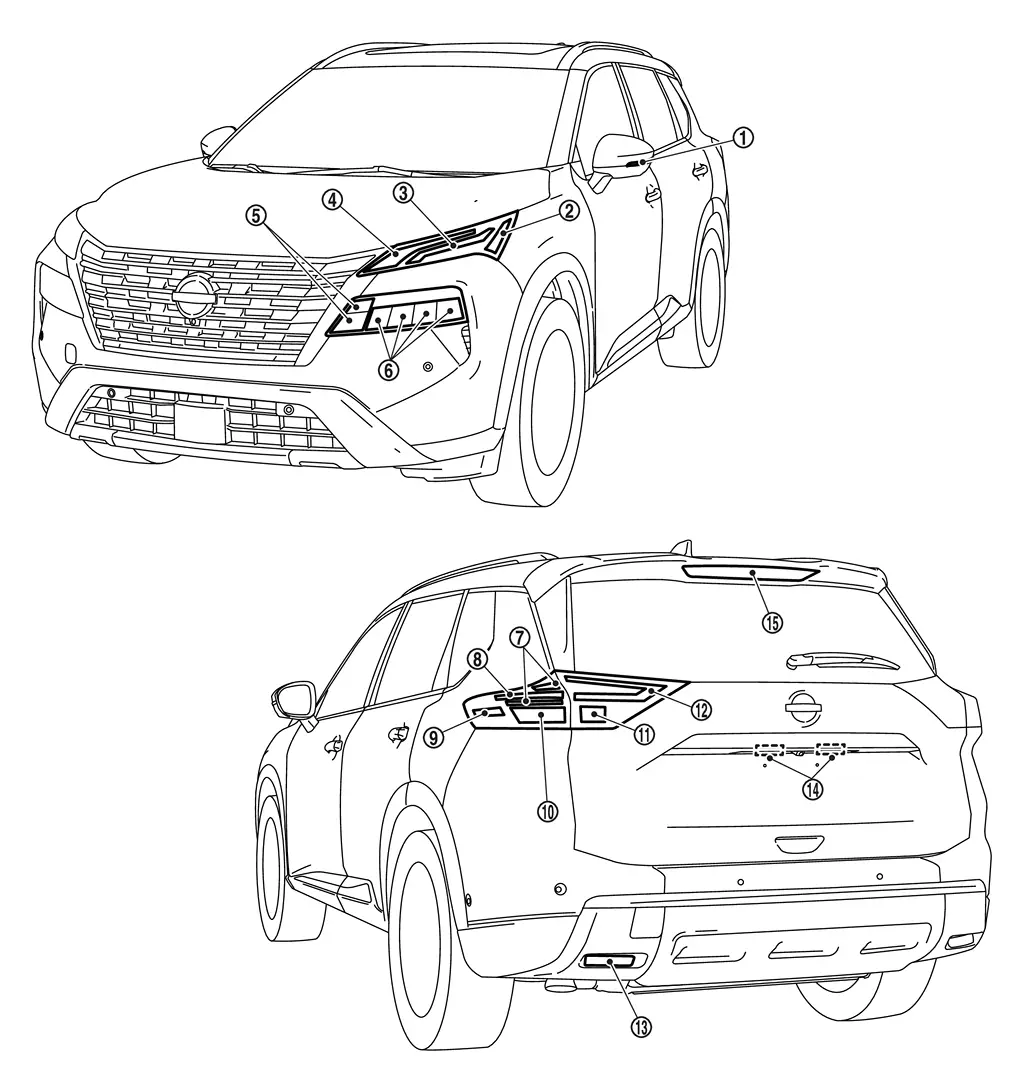| 10. | Rear turn signal lamp | 11. | Back-up lamp | 12. | Tail lamp |