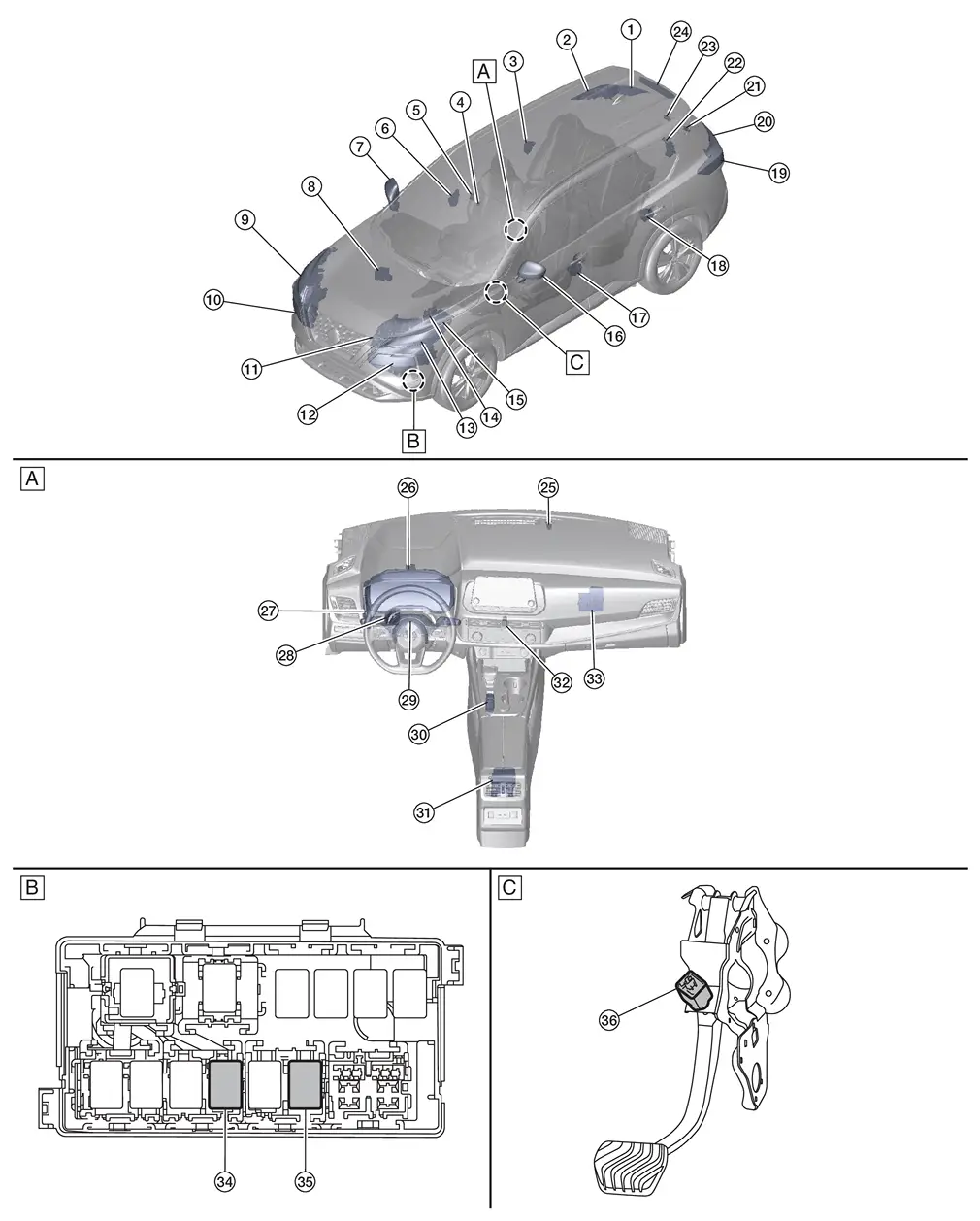 | A. | Instrument panel assembly | B. | Relay box (view with relay box removed) | C. | Brake pedal assembly (view with brake pedal assembly removed) |