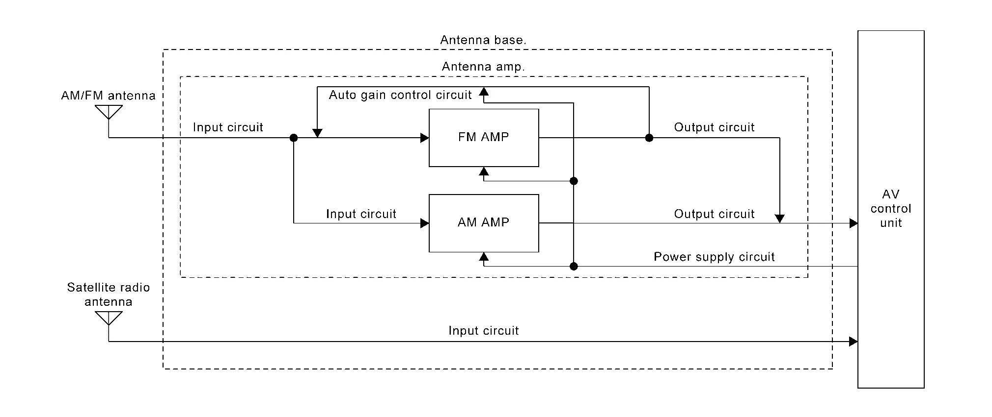 The AM/FM radio main antenna path has an antenna amp. to obtain sufficient reception power.
