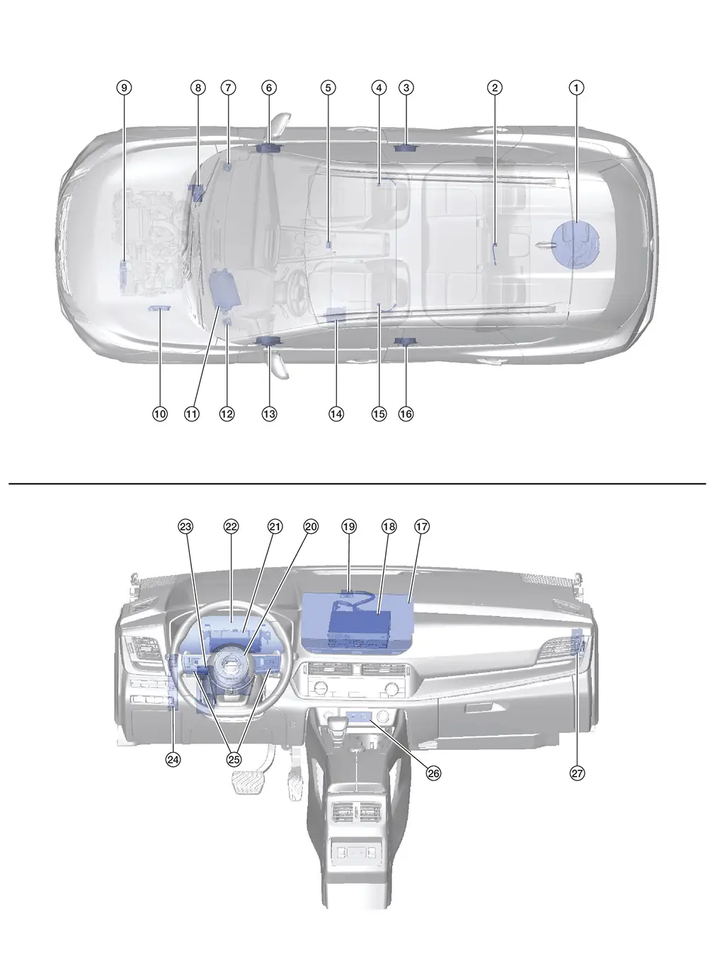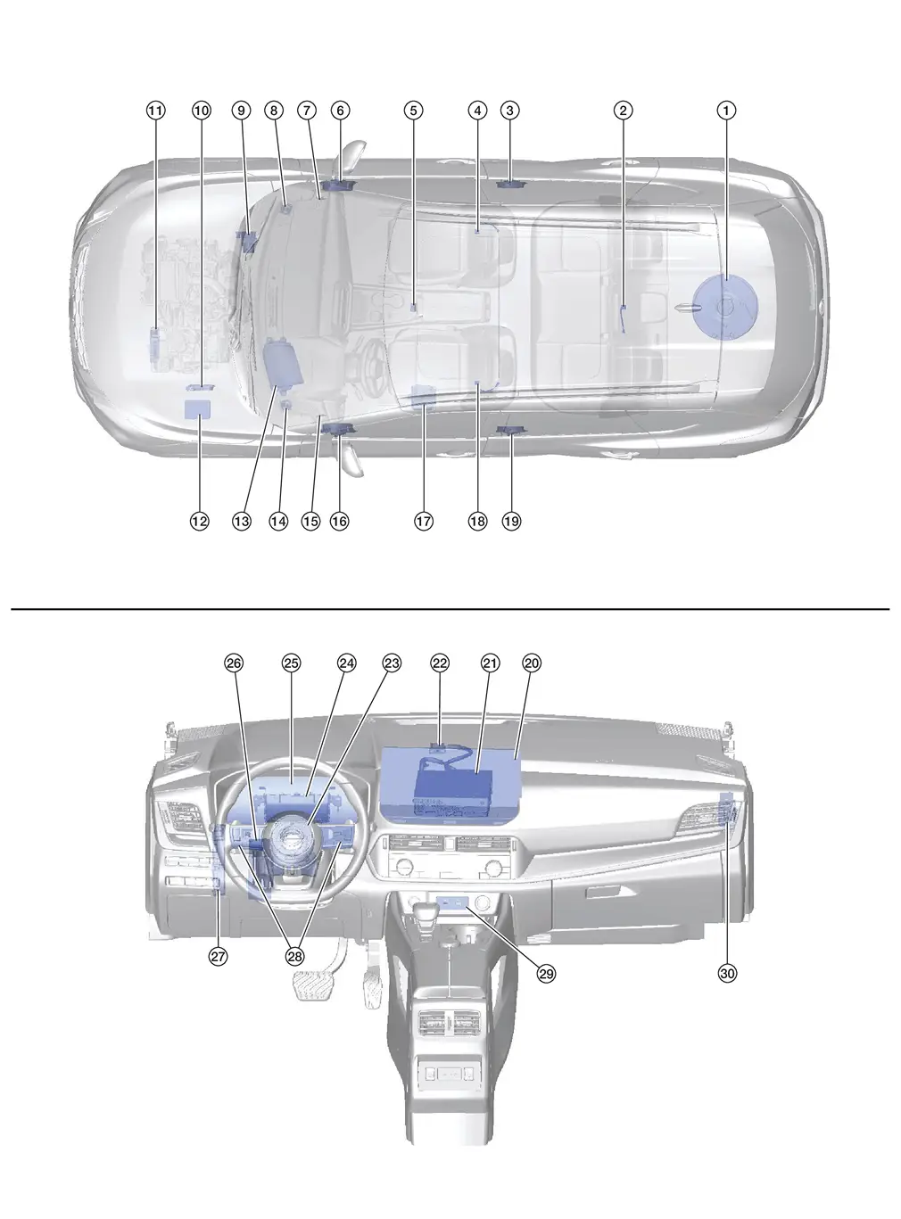 | 23. | Spiral cable | Provides a pass-through for the steering switch signals from the steering switches to the combination meter. |
