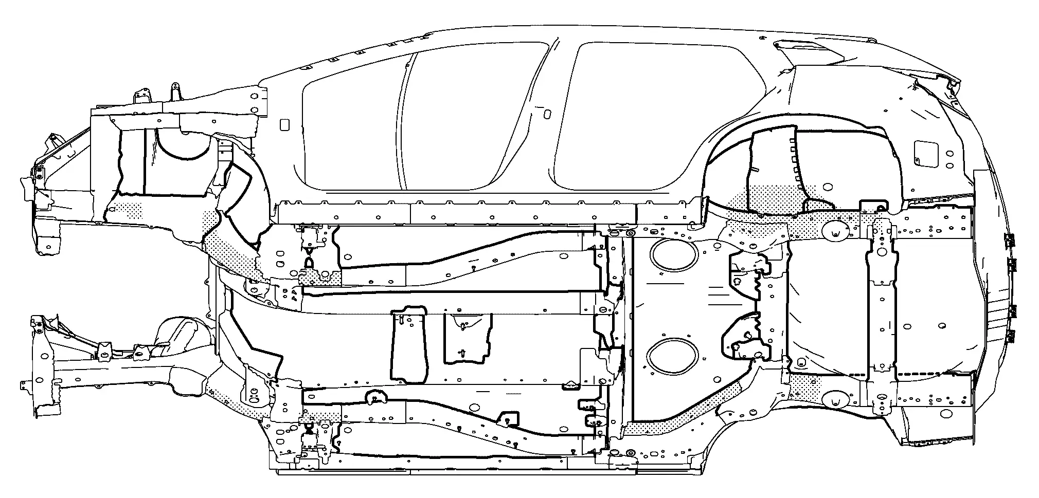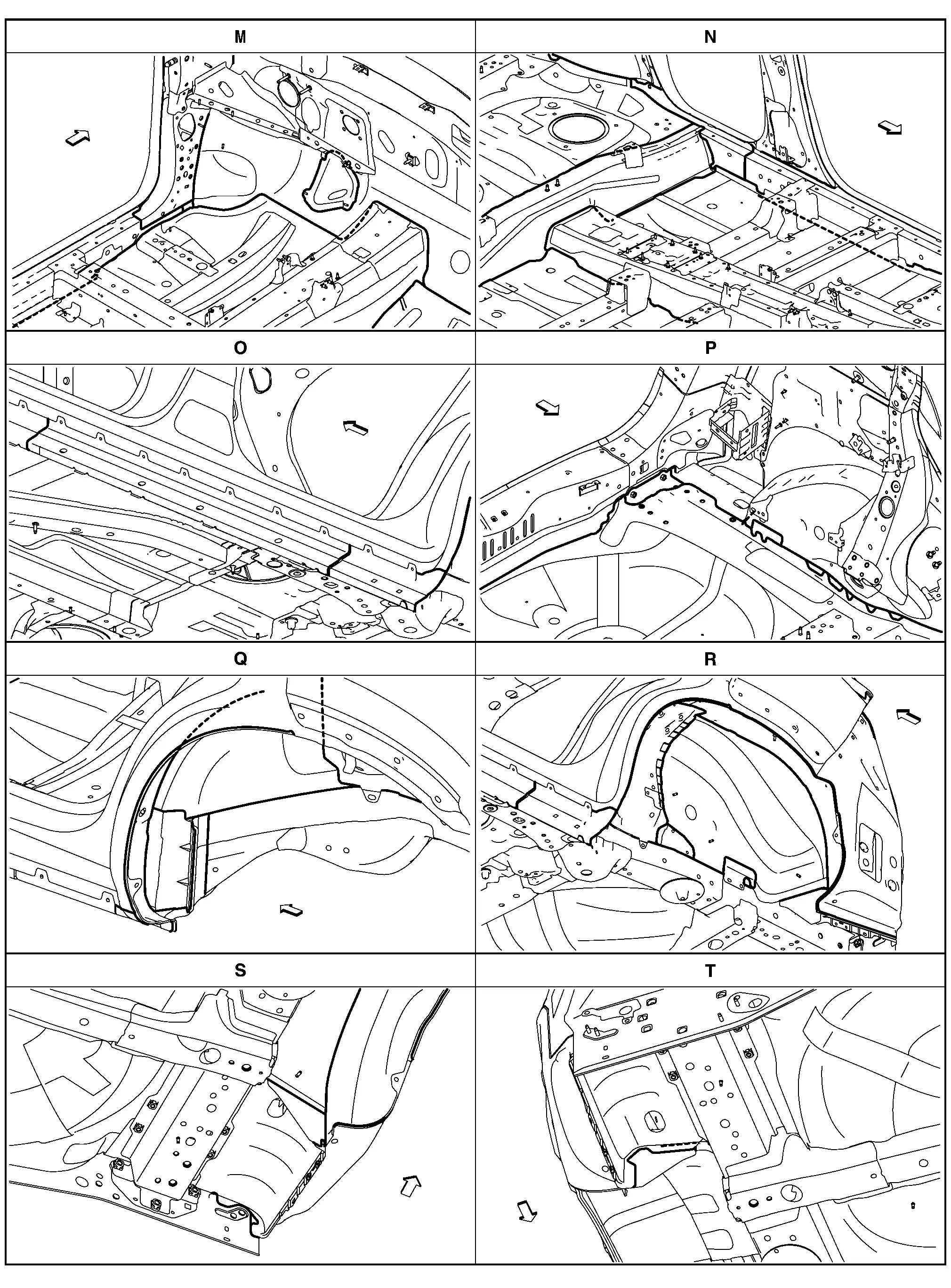 The following figure shows the areas that are sealed at the factory. Sealant that is applied to these areas should be smooth and free from cuts or gaps. Care should be taken not to apply an excess amount of sealant and not to allow other unaffected parts to come into contact with the sealant.