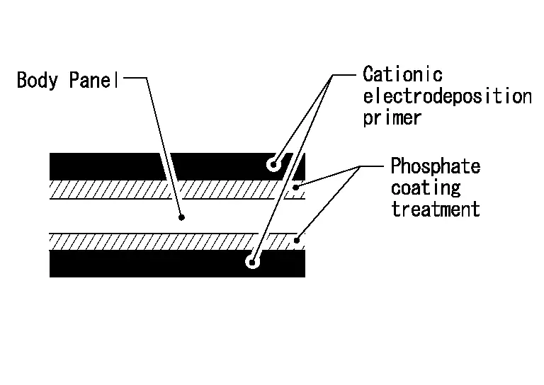 A phosphate coating treatment and a cationic electrodeposition primer, which provide excellent corrosion protection, are applied to all body components.
