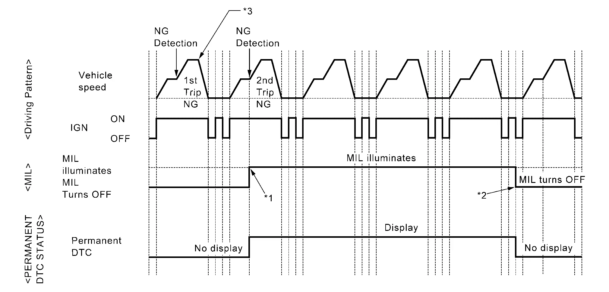 In case of DTC of one trip detection diagnosis, when NG is detected at one trip, MIL turns ON and permanent DTC is displayed.