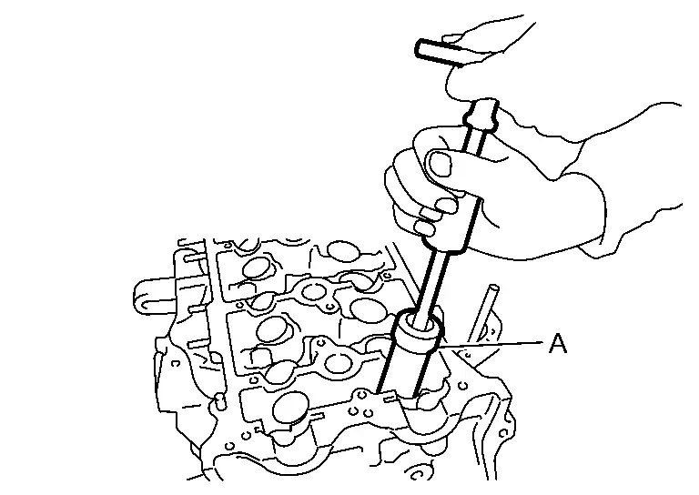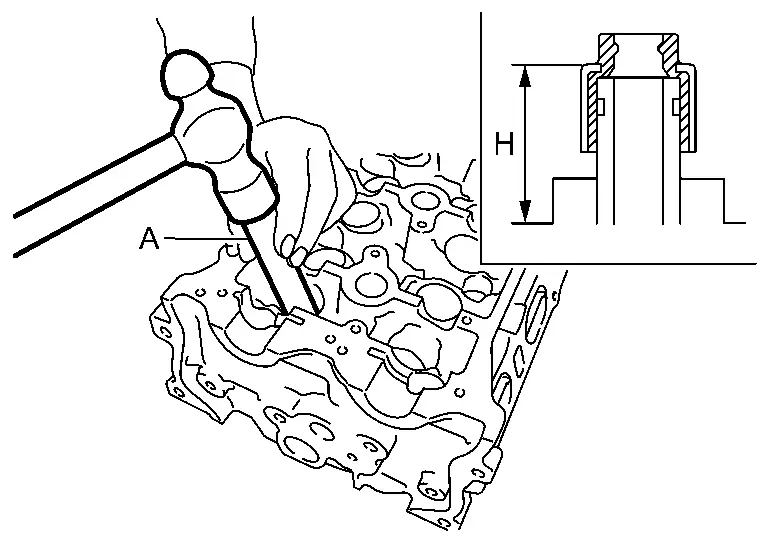 Using compound, grind to adjust valve fitting. Check again for normal contact. Refer to Inspection.Install valve oil seal using suitable tool (A) to the specified height (H).