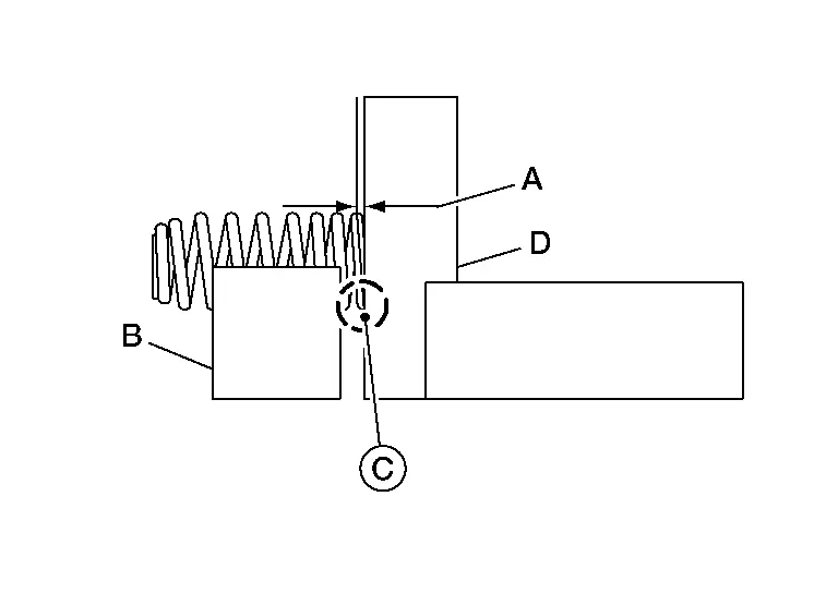 Set a suitable tool (D) along the side of valve spring and rotate spring. Measure the maximum clearance (A) between the top of spring and suitable tool.