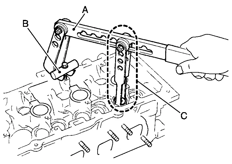 Compress the valve spring with suitable tool (A), (B) and (C) and remove the valve collet with a suitable magnetic tool.