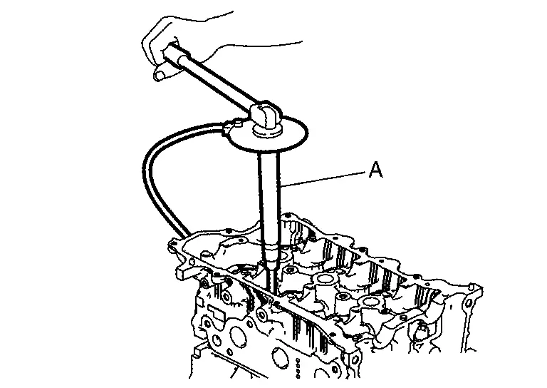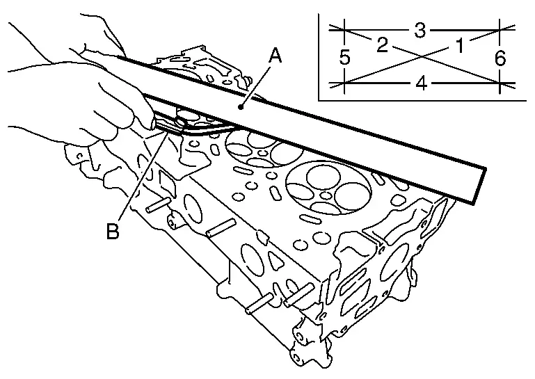 Measure the distortion on the cylinder block upper face at different points in six different directions with a suitable tool (A) and suitable tool (B).