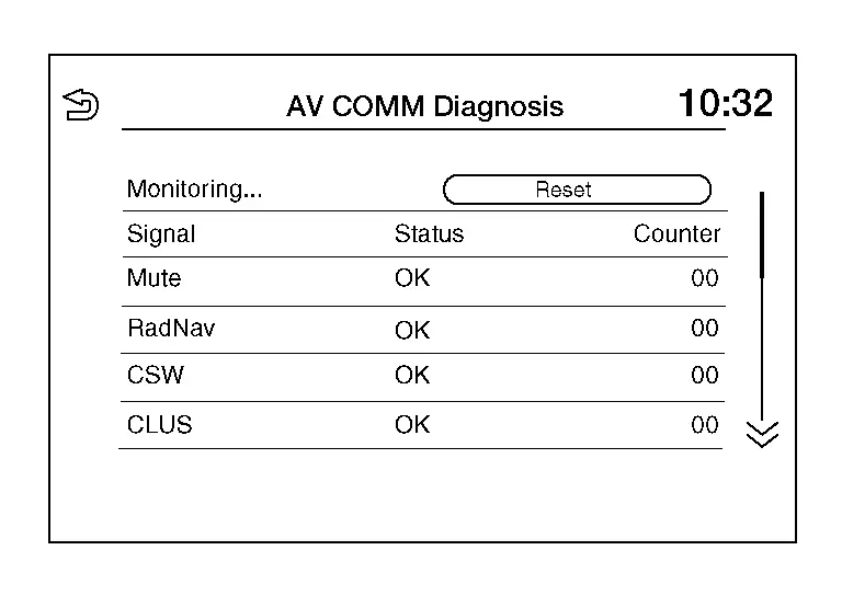 | Self diagnosis result | The AV control unit self diagnosis results are displayed. |