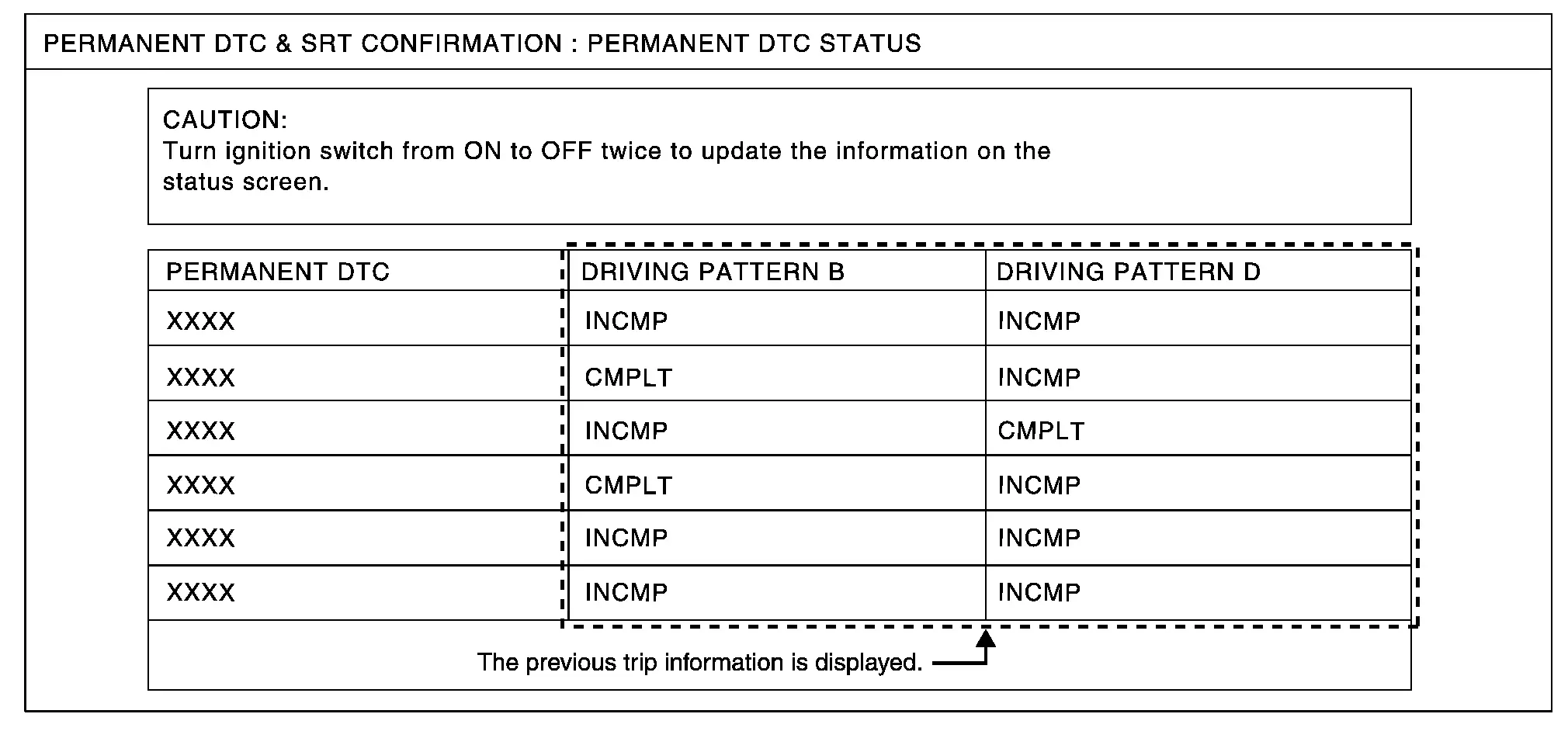 Permanent DTCs stored in control module memory are displayed on the CONSULT screen to show if a driving pattern required for erasing permanent DTCs is complete (CMPLT) or incomplete (INCMP).