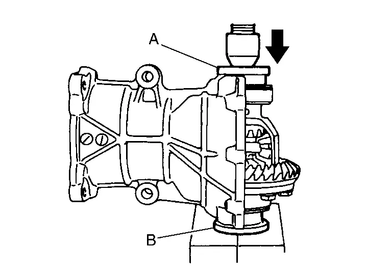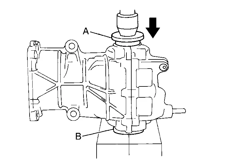 Set drifts (A and B) to the right and left side bearing adjusting shims individually. Press differential assembly with side bearing to remove gear carrier assembly and rear cover assembly.