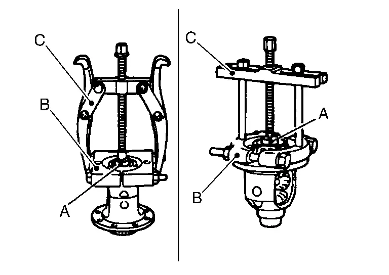 Remove side bearing inner races, using adapter (A), separator (B) and puller (C).
