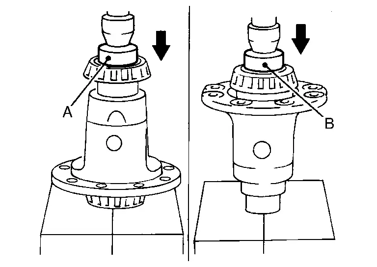 Press side bearing inner races to differential assembly, using the drifts (A and B).