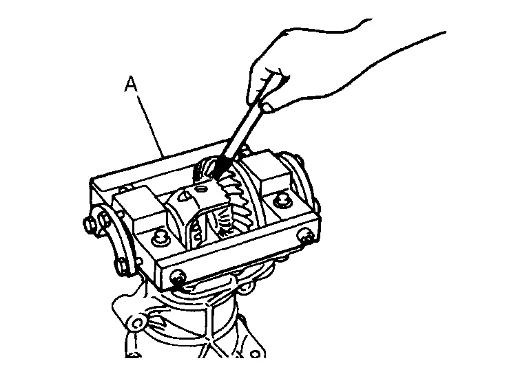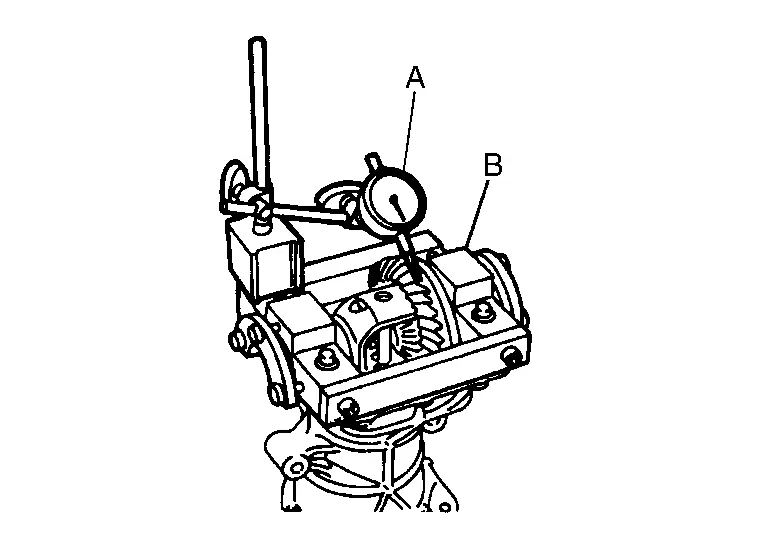 Fit a dial indicator (A) to the drive gear face to measure the backlash.