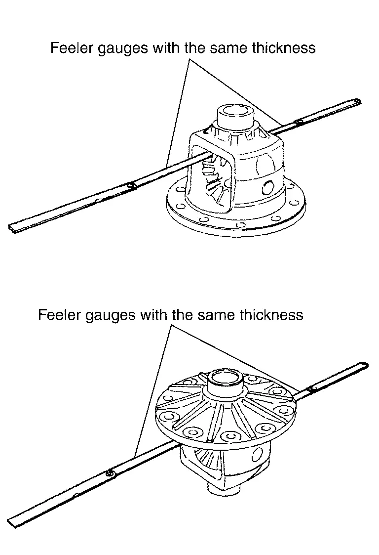To prevent side gear from tilting, insert feeler gauges with the same thickness from both sides.