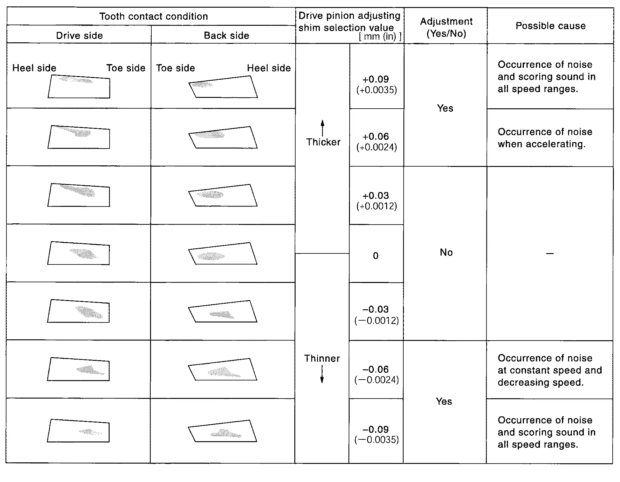 | Make drive gear back adjusting shims thicker, and drive gear front adjusting shims thinner. For selecting adjusting shim, refer to the latest parts information. | |