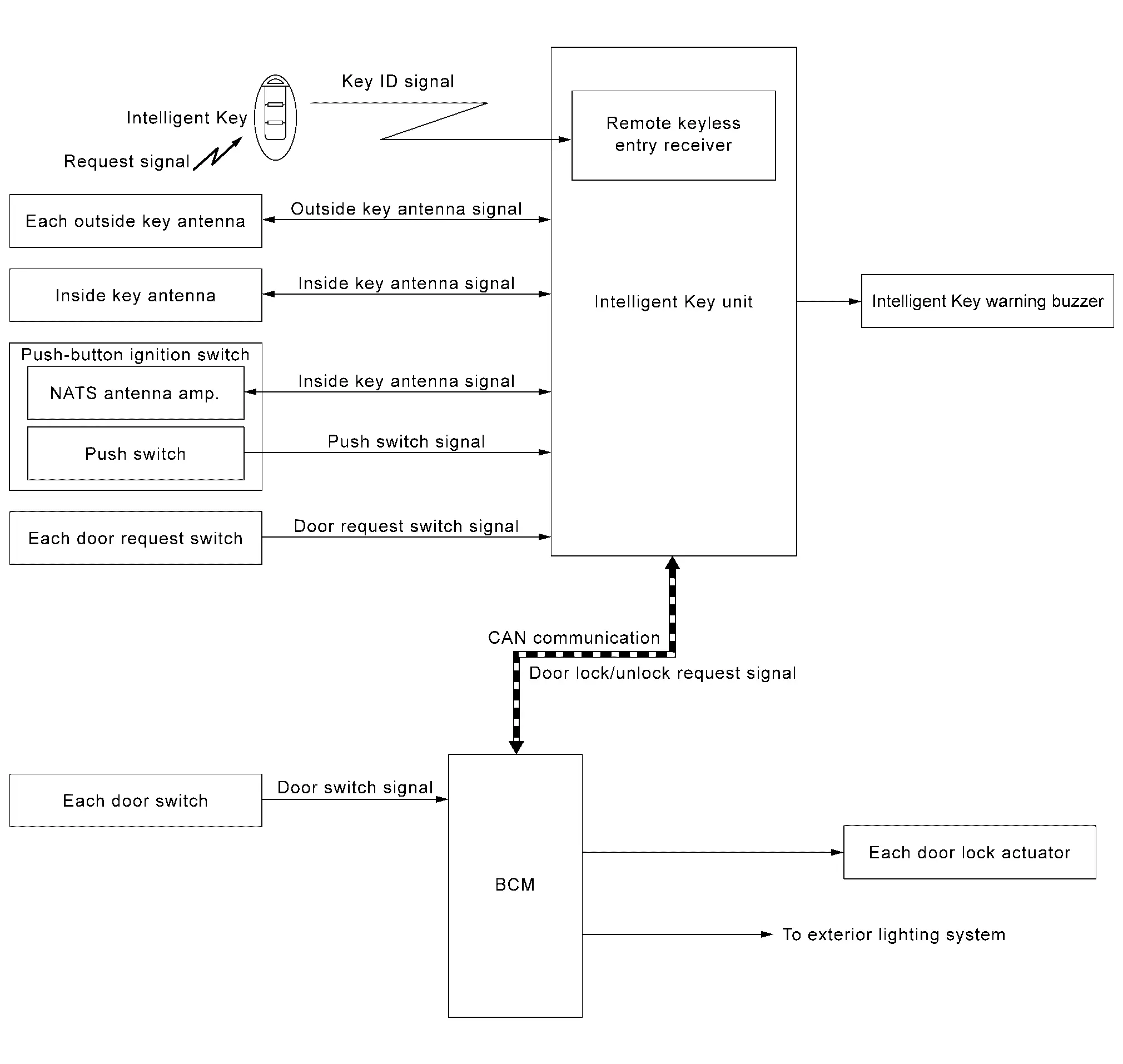 If the Intelligent Key is within the outside key antenna detection area, it receives the request signal and transmits the key ID signal to the Intelligent Key unit via remote keyless entry receiver.