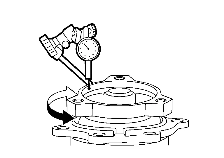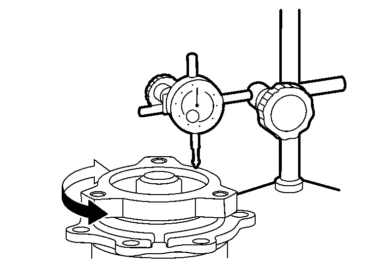 If the runout value is outside the runout limit, follow the procedure below to adjust.Check for runout while changing the phase between companion flange and drive pinion in 90° steps. Then search for the minimum point. Replace companion flange if runout value is still outside the limit after the phase has been changed. Adjust assembly status of the pinion bearing assembly and drive pinion, or replace pinion bearing assembly if runout is outside the standard after the companion flange is replaced.