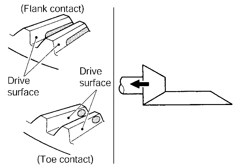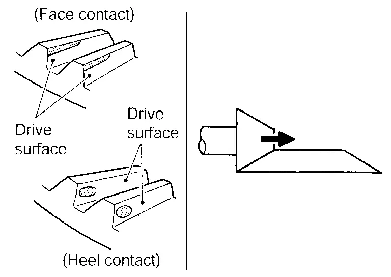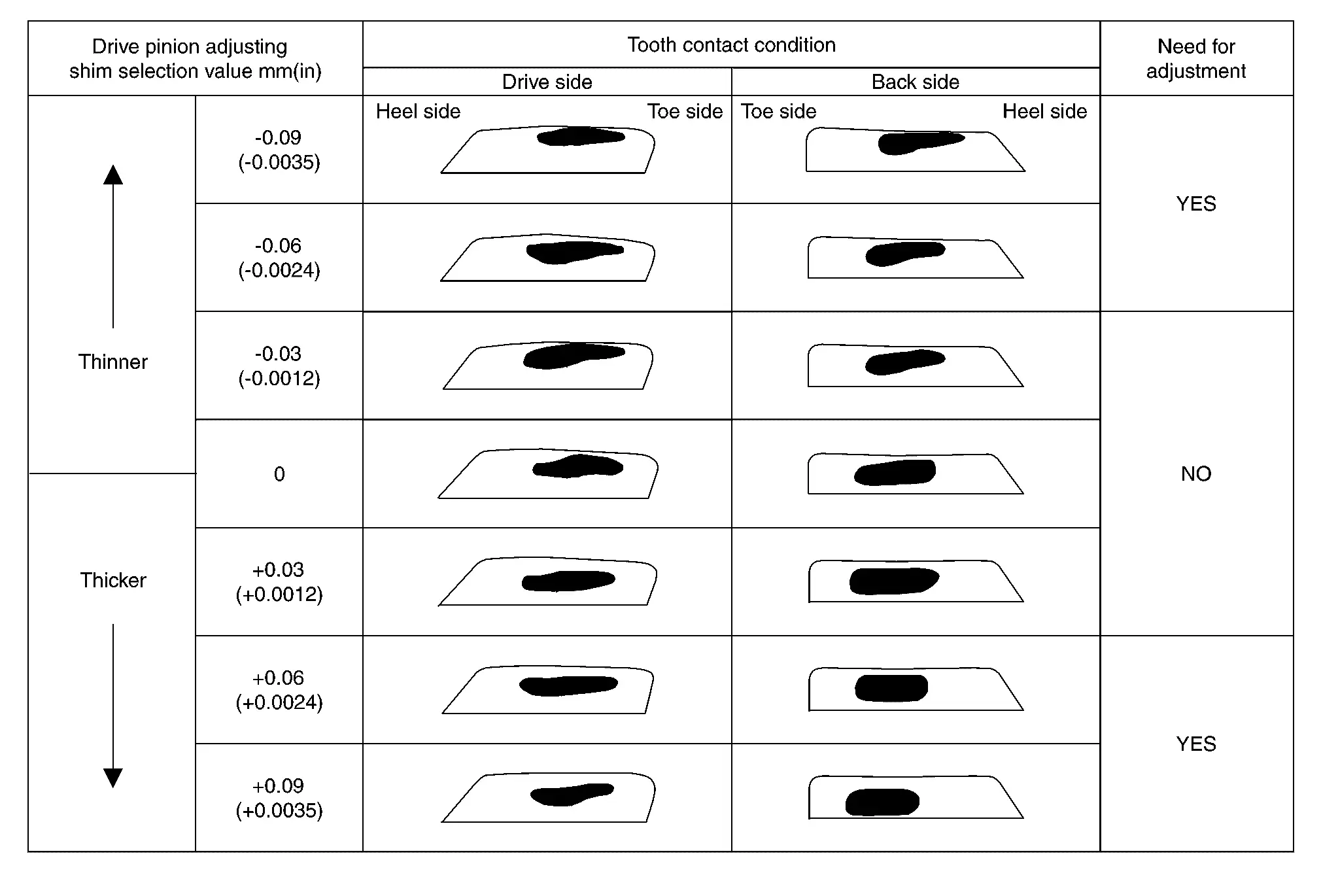 Thicken the drive pinion adjusting shim to move the drive pinion closer to the ring gear in case of face contact or heel contact.
