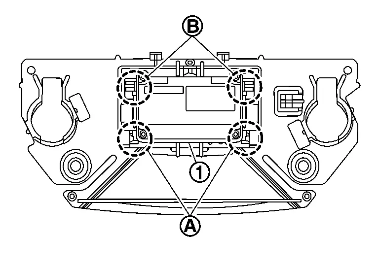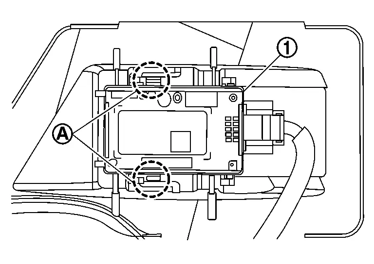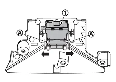 Press tabs (A) on driver assistance camera bracket as shown and remove driver assistance camera (1) from bracket.