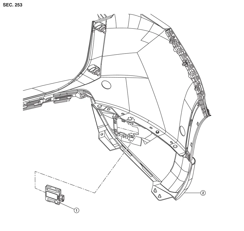 | 1. | Side radar rear (LH) | 2. | Rear bumper fascia trim (LH) | ![]() |