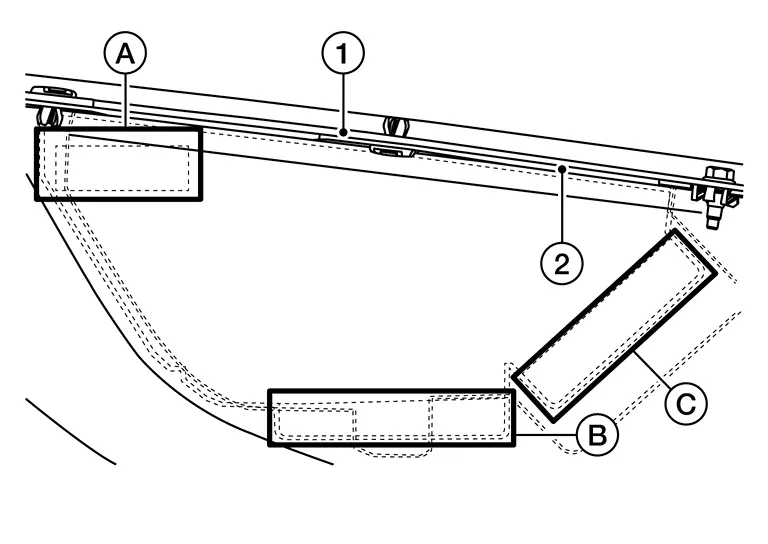 Clean the matching surfaces (A, B, C) on the rear bumper fascia trim thoroughly using 3M K55, K520, or equivalent adhesive promoter.