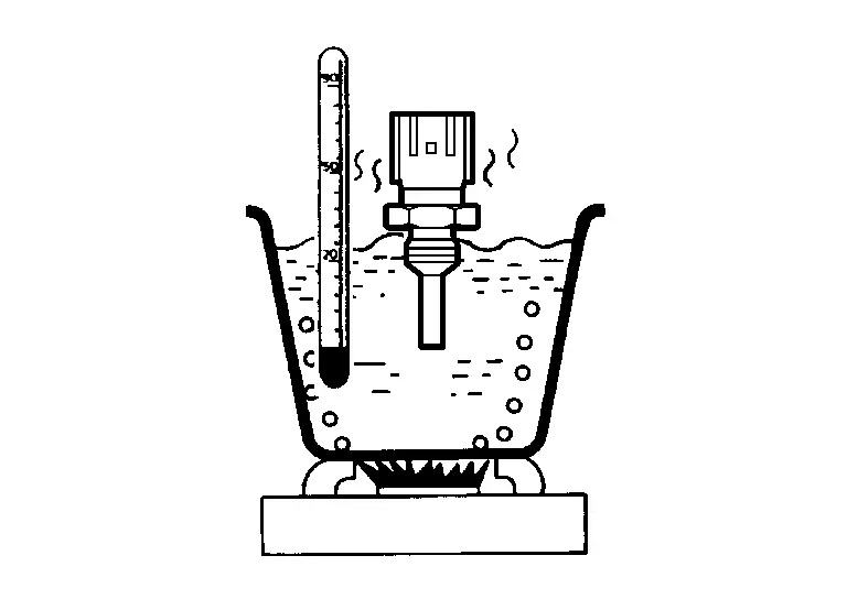Check the resistance between engine coolant temperature sensor 1 terminals by heating with hot water as shown in the figure.