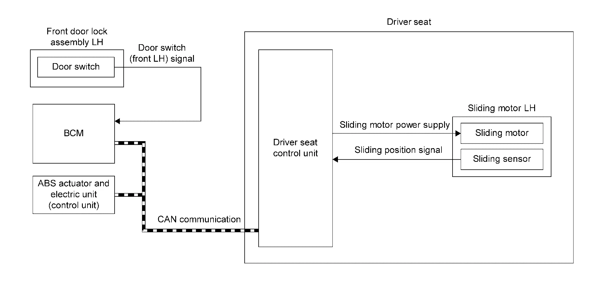 — | Driver seat control unit receives door switch (driver side/open) signal from BCM via CAN communication. |