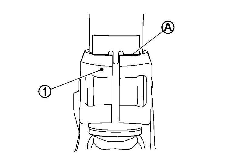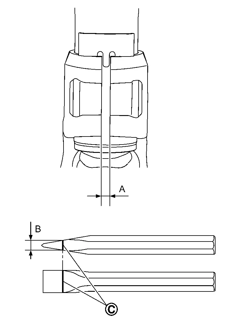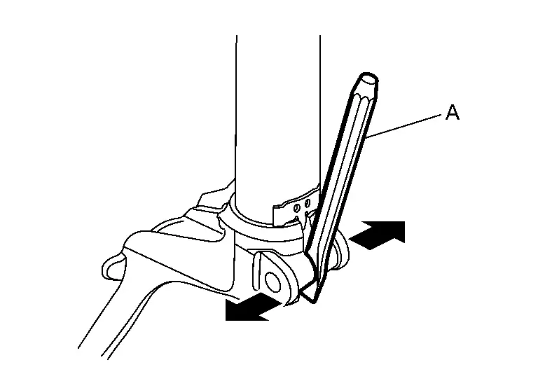 Enlarge the gap of the steering knuckle with the chisel (A) (commercial service tool) not to surpass a limit as shown in the figure.