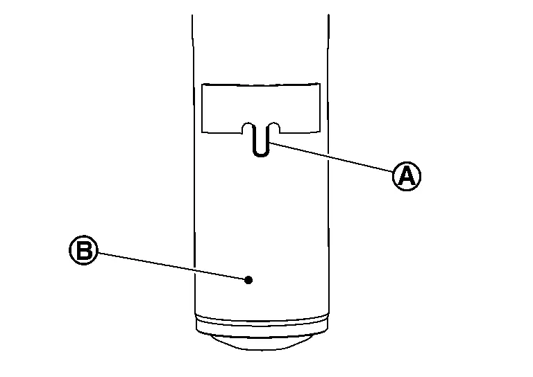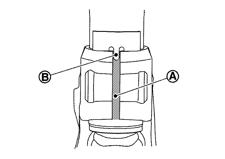 Remove strut mounting bolt and nut from steering knuckle. Measure the gap (A) of the steering knuckle. And then mark the enlarged limit (B) to the chisel.