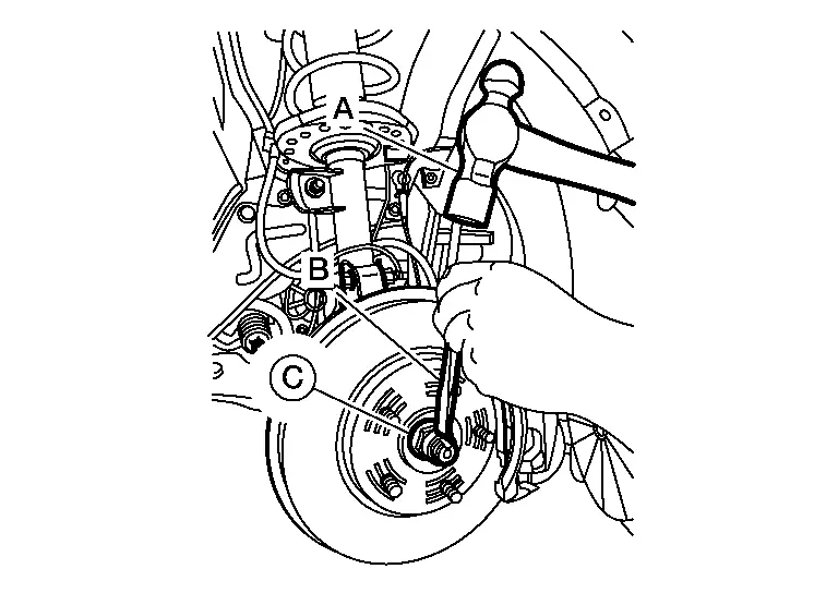 Using suitable tool (A) and cold chisel (B) stake the wheel hub lock nut (C) as shown.