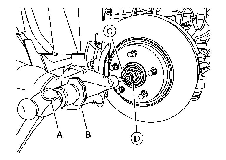 Using suitable tool (A) and Tool (B) release staked area (C) of wheel hub lock nut (D).