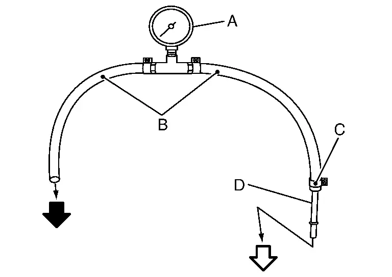 Connect fuel hose for fuel pressure check (B) to fuel pressure gauge (A). Then, connect fuel hose for fuel pressure check to fuel tube adapter (SST: KV10120000) (D) with hose clamp (C).
