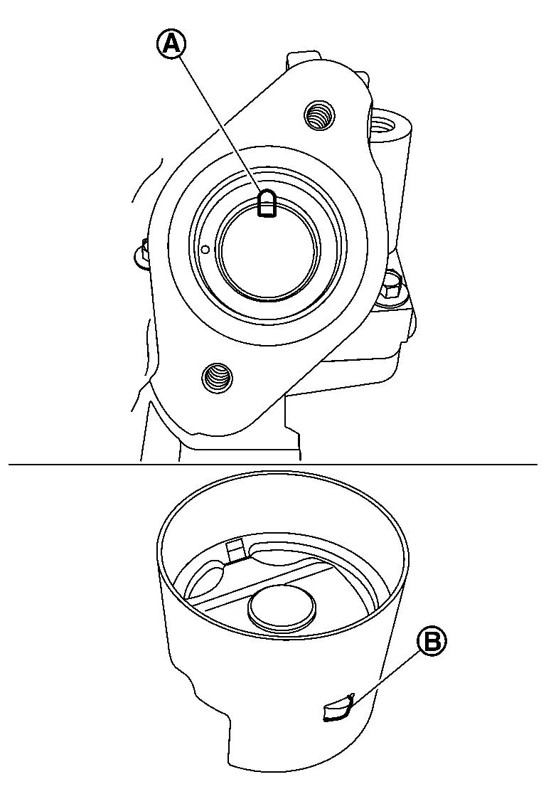 When installing high pressure fuel pump lifter, note the orientation of protrusion (B) and cutout (A) in camshaft bracket, they should be aligned.