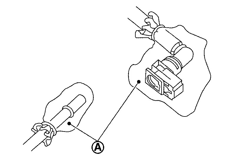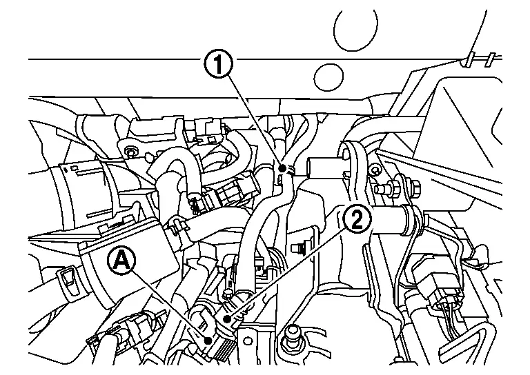 Disconnect quick connector (A) with the following procedure.Disconnect fuel feed hose (2) from bracket hose clamp (1).